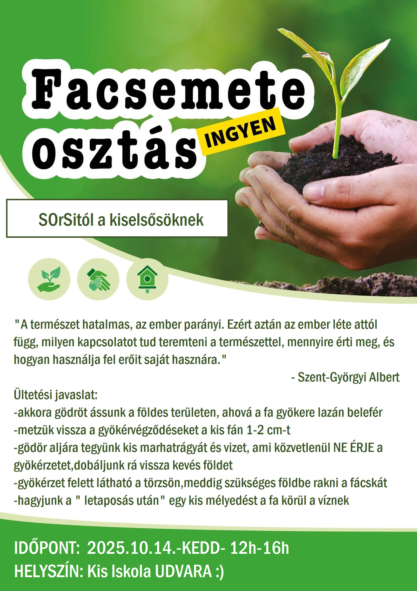 10.14. KEDD reggel szedik ki idén a kis fákat a kertészetben, és egyből viszem a kis Iskolába aznap, vízbe állítom, ráteszem a neveket, osztályokra sorolom őket, és mikor jönnek a gyerekekért, odaadom a gyerekeknek…! És Ti délután közösen el is tudjátok ültetni őket közösen.